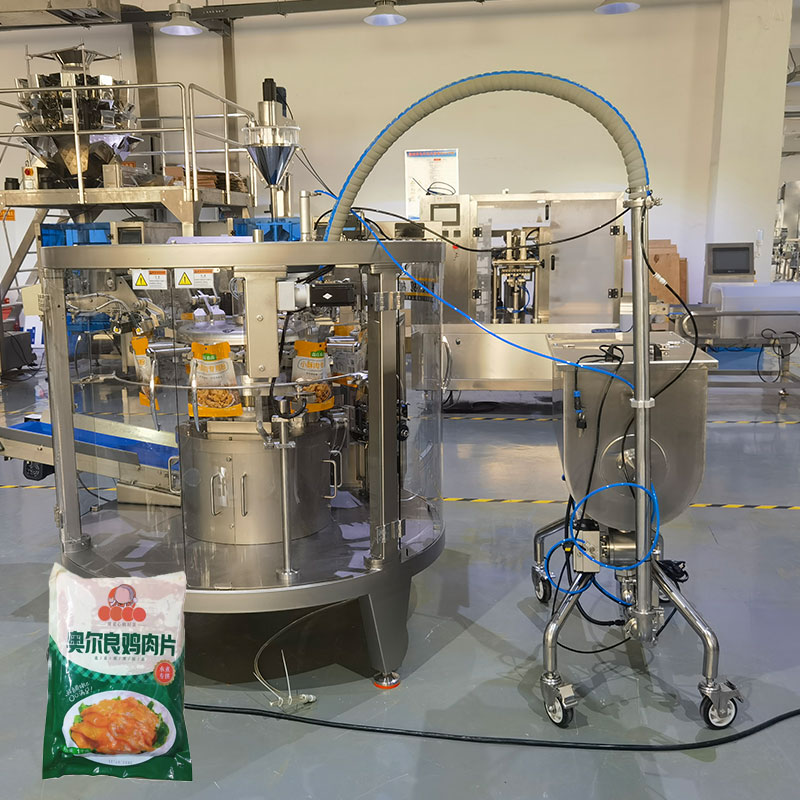 1、多工位集成作業,腌制雞肉片包裝機械集自動上料、稱重、制袋、充填、封口、沖孔、計數于一體化的設計,支持枕式袋、插腳袋、手提袋等多種袋型。