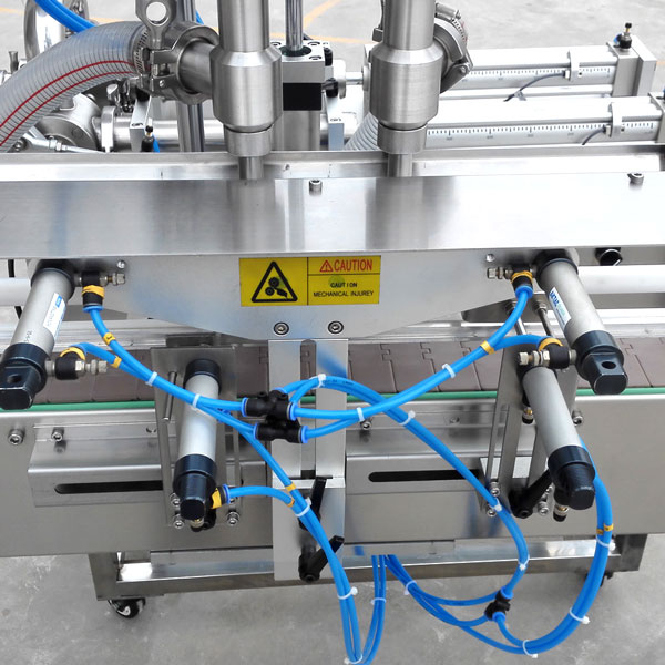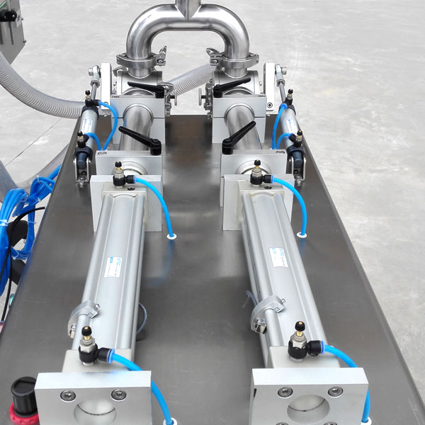 1、半自動雙頭辣椒醬灌裝設備可以通過操作人員用腳踏控制開關,也可以設置光電感應開關,一次性自動完成計量、下料,將粘稠醬類、花生醬類等物料直接灌入容器中即完成一次動作。